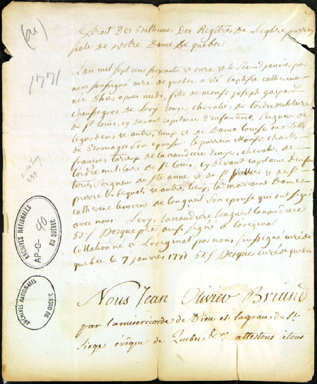 Acte de baptême de Catherine Chaussegros de Léry - Mgr Briand authentifie l'acte, 1er janvier 1771, Archives nationales à Québec, Fonds Famille Chaussegros de Léry, (03Q,P386,D339).
