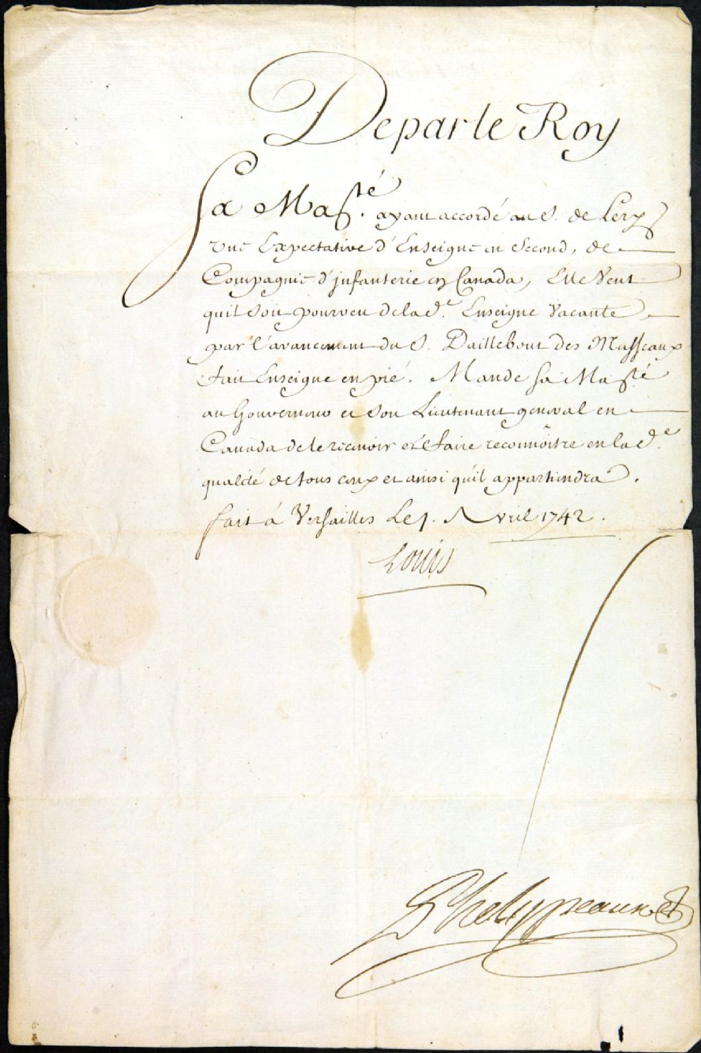 Brevet d'enseigne en second de la compagnie d'infanterie du Canada accordé par le roi Louis XV à [Gaspard-Joseph Chaussegros] de Léry, 1er avril 1742, Archives nationales à Québec, Fonds Famille Chaussegros de Léry, (03Q,P386,D367).