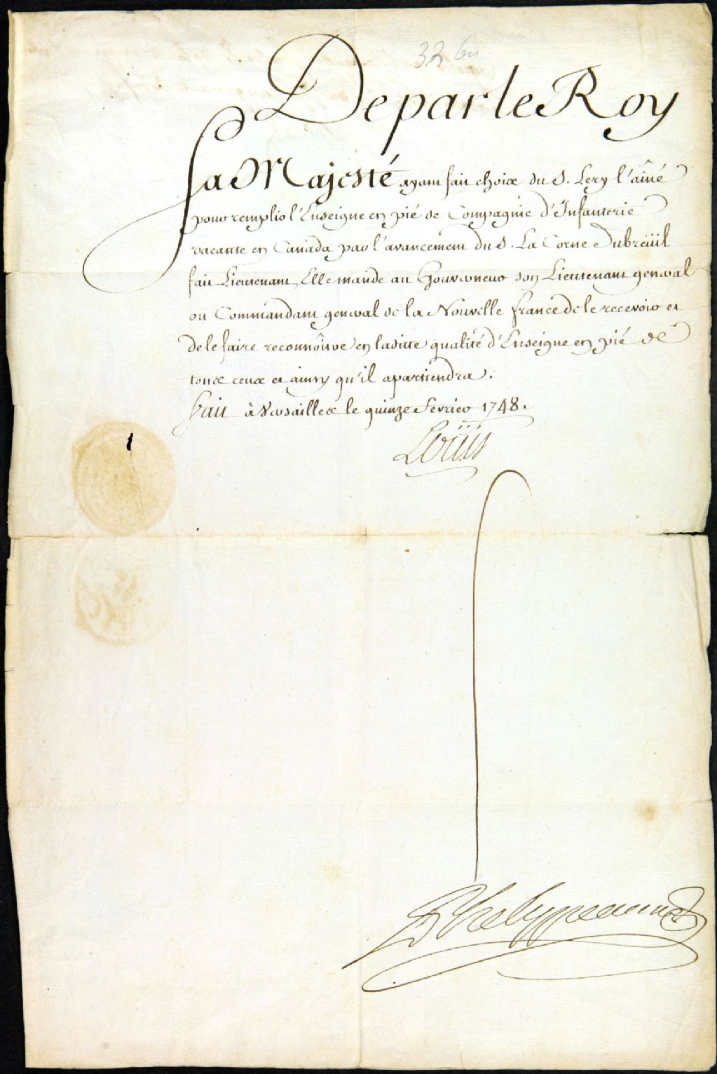 Brevet d'enseigne à vie de la compagnie d'infanterie du Canada par le roi Louis XV à [Gaspard-Joseph Chaussegros] de Léry, 15 février 1748, Archives nationales à Québec, Fonds Famille Chaussegros de Léry, (03Q,P386,D368).