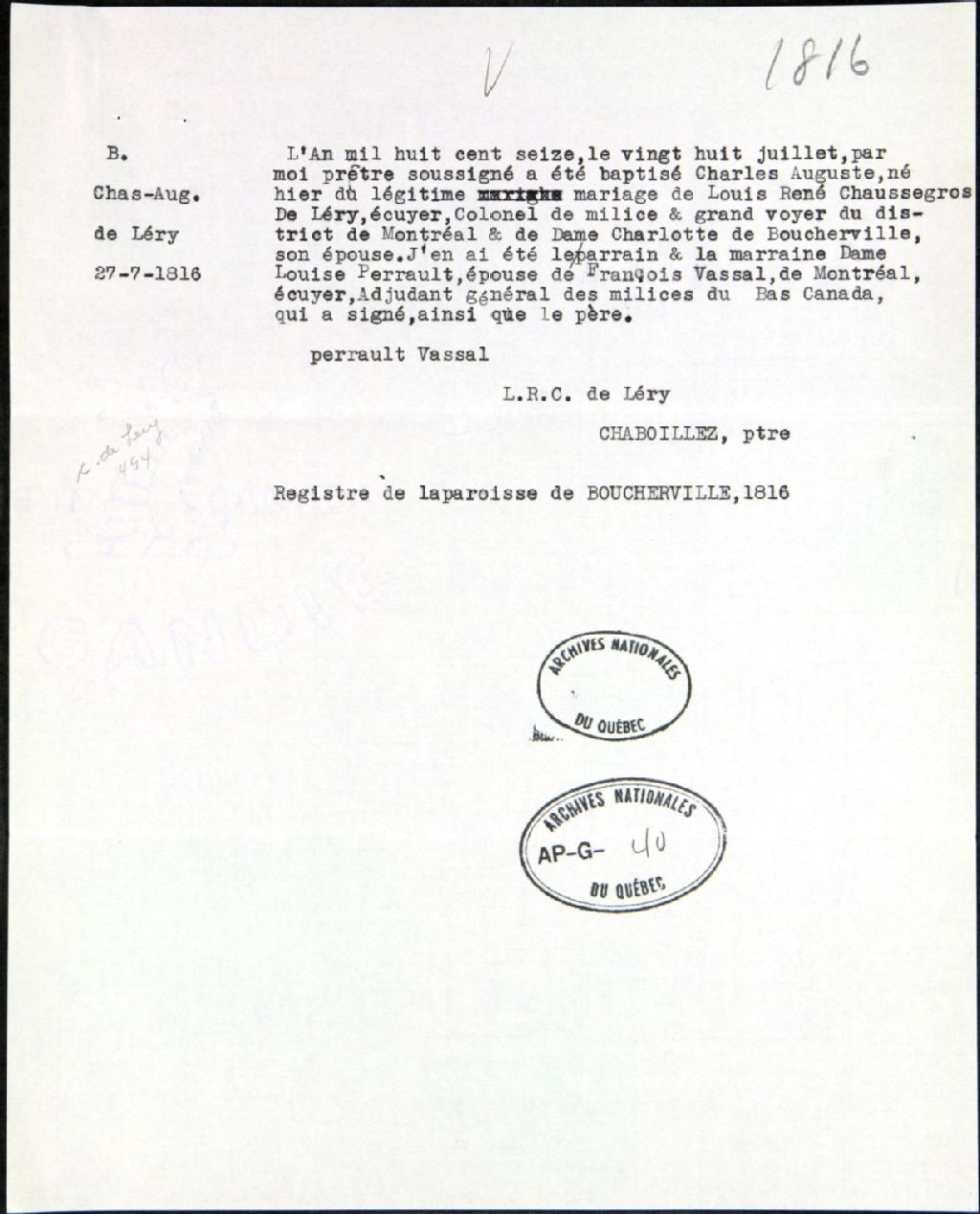 Acte de baptême de Charles-Auguste, fils de Louis-René Chaussegros de Léry, 28 juillet 1816, Archives nationales à Québec, Fonds Famille Chaussegros de Léry, (03Q,P386,D494).