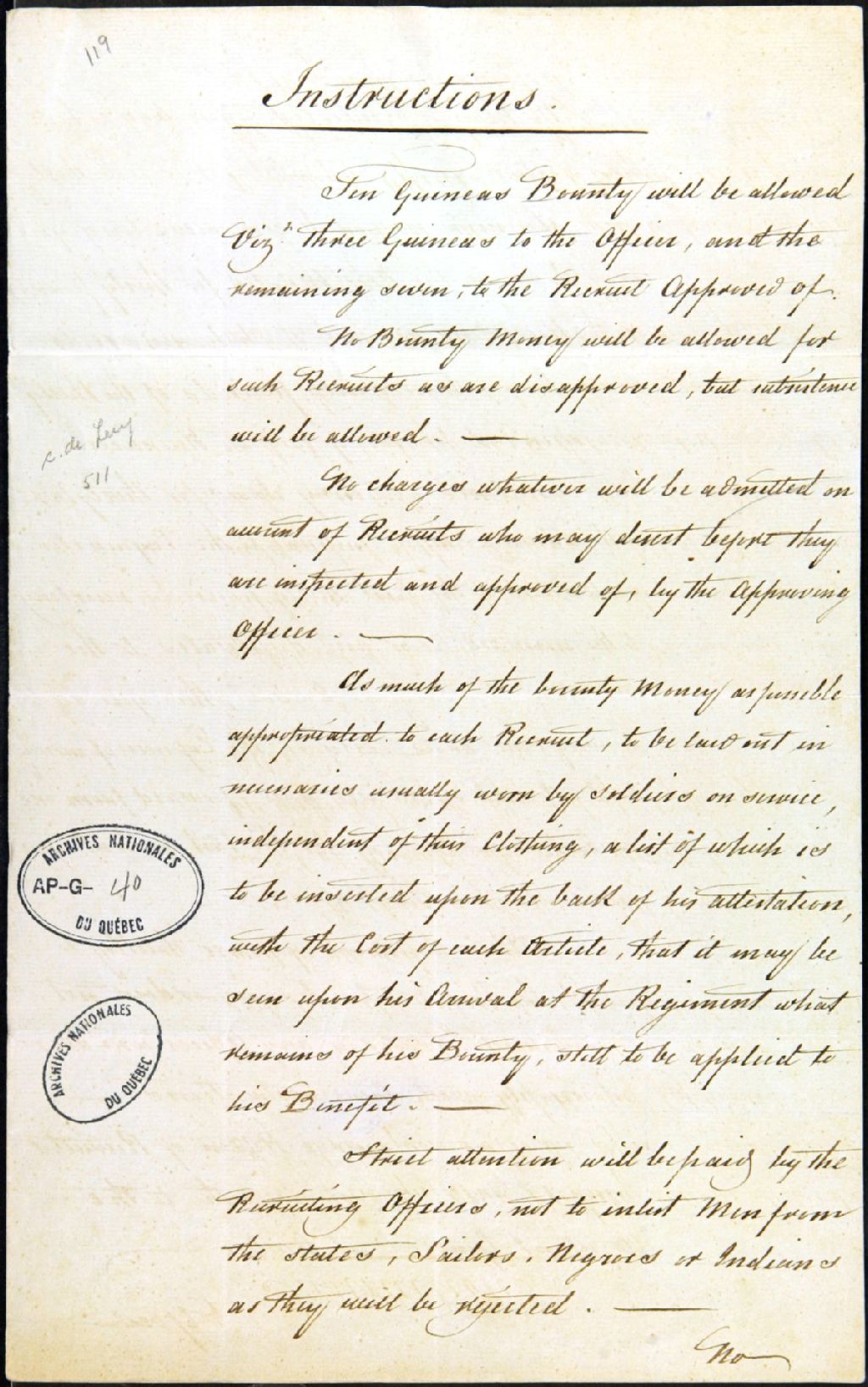 Instructions à Louis-René Chaussegros de Léry par James Green, secrétaire militaire
