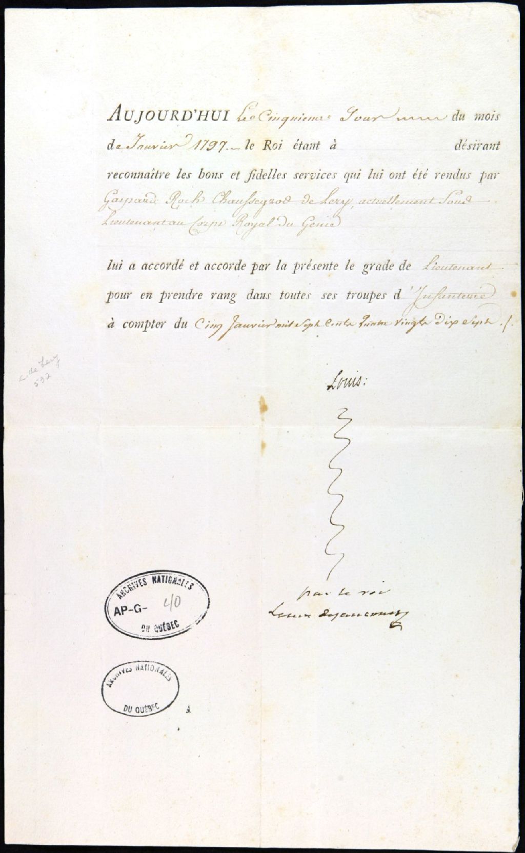 Nomination de Gaspard-Roch-George Chaussegros de Léry à la charge de lieutenant d'infanterie