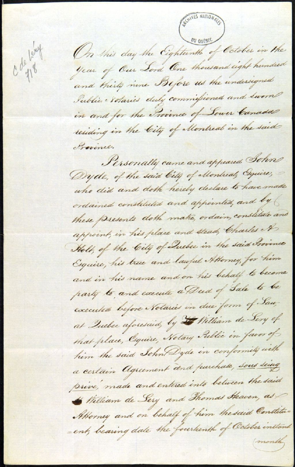 Acte notarié fait par le notaire Charles-Édouard Gagnon - il s'agit d'une vente de terre par Marguerite Déjarlais, veuve de Jean-Baptiste Saucier, à William Chaussegros de Léry, 18 octobre 1839, Archives nationales à Québec, Fonds Famille Chaussegros de Léry, (03Q,P386,D718).