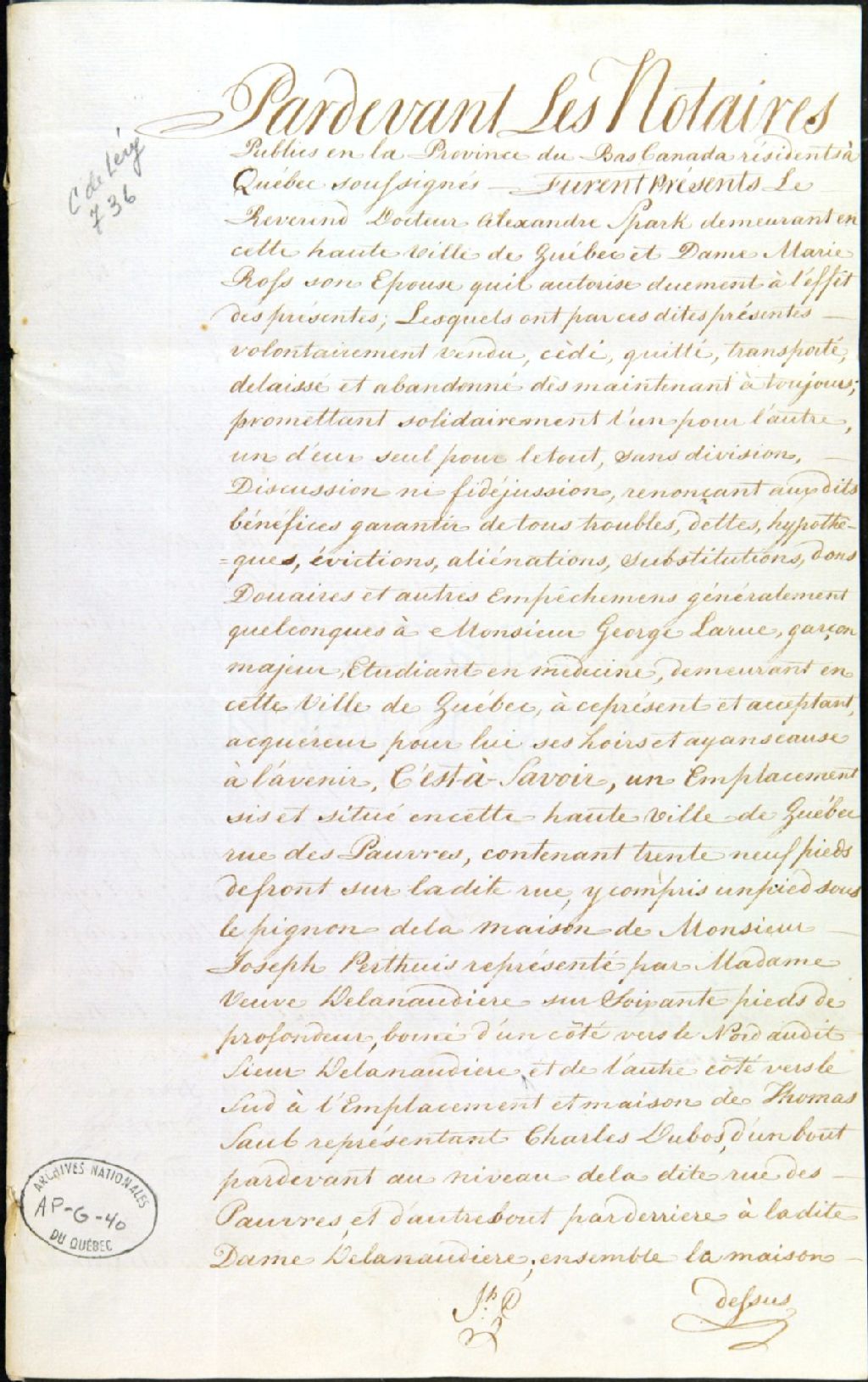 Acte notarié fait par le notaire Joseph Plante - il s'agit d'une vente d'emplacement situé sur la rue des Pauvres dans la Haute-Ville de Québec par Alexandre [Alexander] Sparks et Marie Ross, son épouse, à George Larue, étudiant en médecine