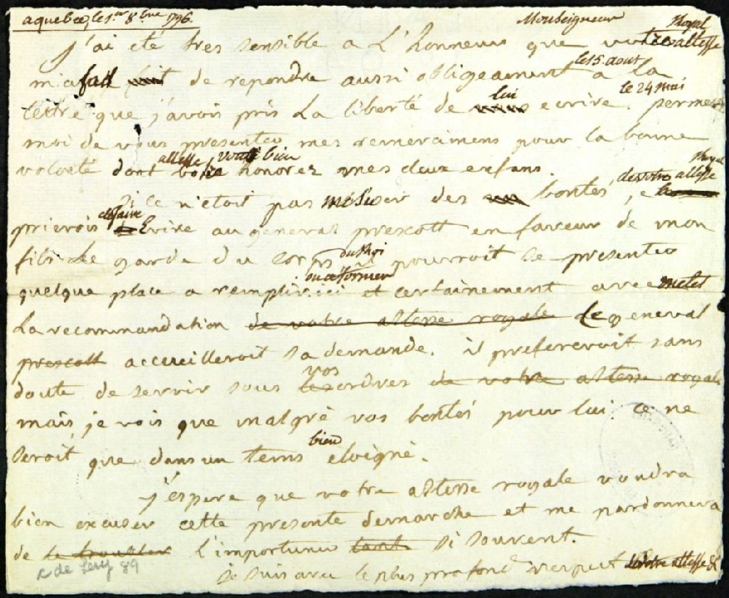 - Version intégrale légèrement normalisée : «À Québec le 1er octobre 1796. Monseigneur, J'ai été très sensible à l'honneur que votre altesse royale m'a fait de répondre aussi obligeamment le 15 août à la lettre que j'avais pris la liberté de lui écrire le 24 mai. Permettez-moi de vous présenter mes remerciements pour la bonne volonté dont votre altesse veut bien honorer mes deux enfants. Si ce n'était pas mésuser des bontés de votre altesse royale je la prierais de faire écrire au général Prescott en faveur de mon fils le garde du corps du Roi, il pourrait se présenter quelque place à remplir ou à former ici et certainement avec une telle recommandation ce général accueillerait sa demande, il préférerait sans doute de servir sous vos ordres mais je vois que malgré vos bontés pour lui, ce ne serait que dans un temps bien éloigné. J'espère que votre altesse royale voudra bien excuser cette présente démarche et me pardonnera de l'importuner [...]