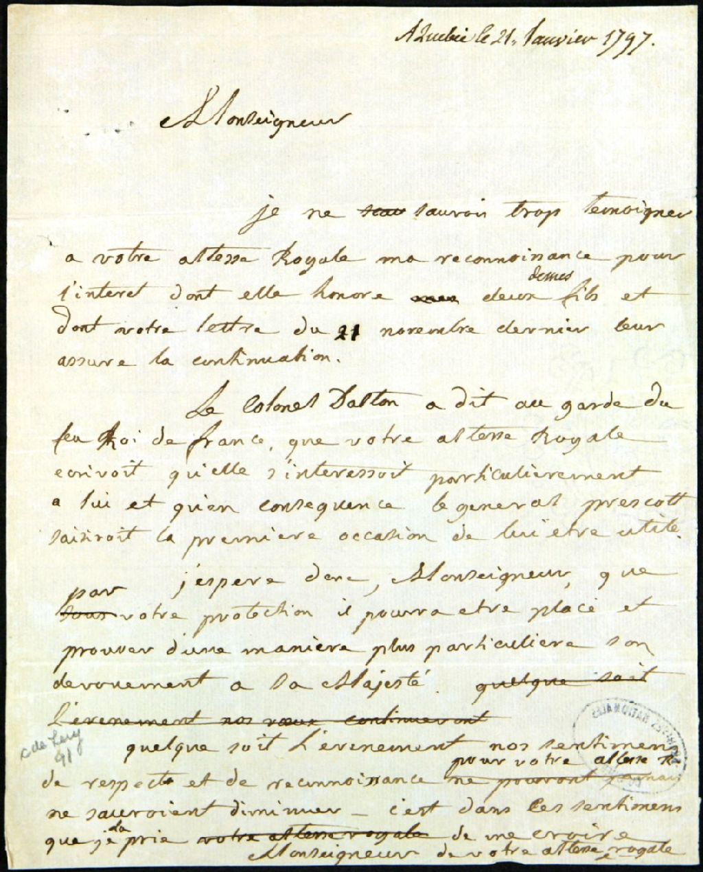 - Version intégrale légèrement normalisée : «À Québec le 21 janvier 1797. Monseigneur, Je ne saurais trop témoigner à votre altesse royale ma reconnaissance pour l'intérêt dont elle honore deux de mes fils et dont votre lettre du 21 novembre dernier leur assure la continuation. Le colonel Dalton a dit au garde du feu Roi de France, que votre altesse royale écrivait qu'elle s'intéressait particulièrement à lui et qu'en conséquence le général Prescott saisirait la première occasion de lui être utile. J'espère donc, Monseigneur, que par votre protection il pourra être placé et prouver d'une manière plus particulière son dévouement à Sa Majesté. Quelque soit l'événement nos sentiments de respect et de reconnaissance pour votre altesse royale ne sauraient diminuer ¿ c'est dans ces sentiments que je la prie de me croire, Monseigneur de votre altesse royale etc.»