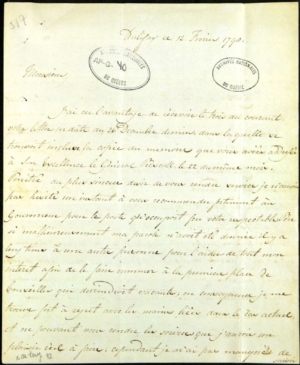 - Version intégrale légèrement normalisée : «Halifax, ce 12 février 1798. Monsieur. J'ai eu l'avantage de recevoir le trois du courant, votre lettre en date du 26 décembre dernier, dans laquelle se trouvait incluse la copie du mémoire que vous aviez adressé à son excellence le général Prescott, le 22 du même mois. Pénétré du plus sincère désir de vous rendre service je n'aurais pas hésité un instant à vous recommander fortement au gouverneur pour le poste qu'occupait feu votre respectable père si malheureusement ma parole n'avait été donnée il y a long temps à une autre personne pour l'aider de tout mon intérêt afin de le faire nommer à la première place de conseiller qui deviendrait vacante; en conséquence je me trouve fort à regret avec les mains liées dans le cas actuel, et ne pouvant vous rendre les services que j'aurais un plaisir réel à faire; cependant je n'ai pas manqué de saisir l'occasion de rappeler au souvenir du général [...]