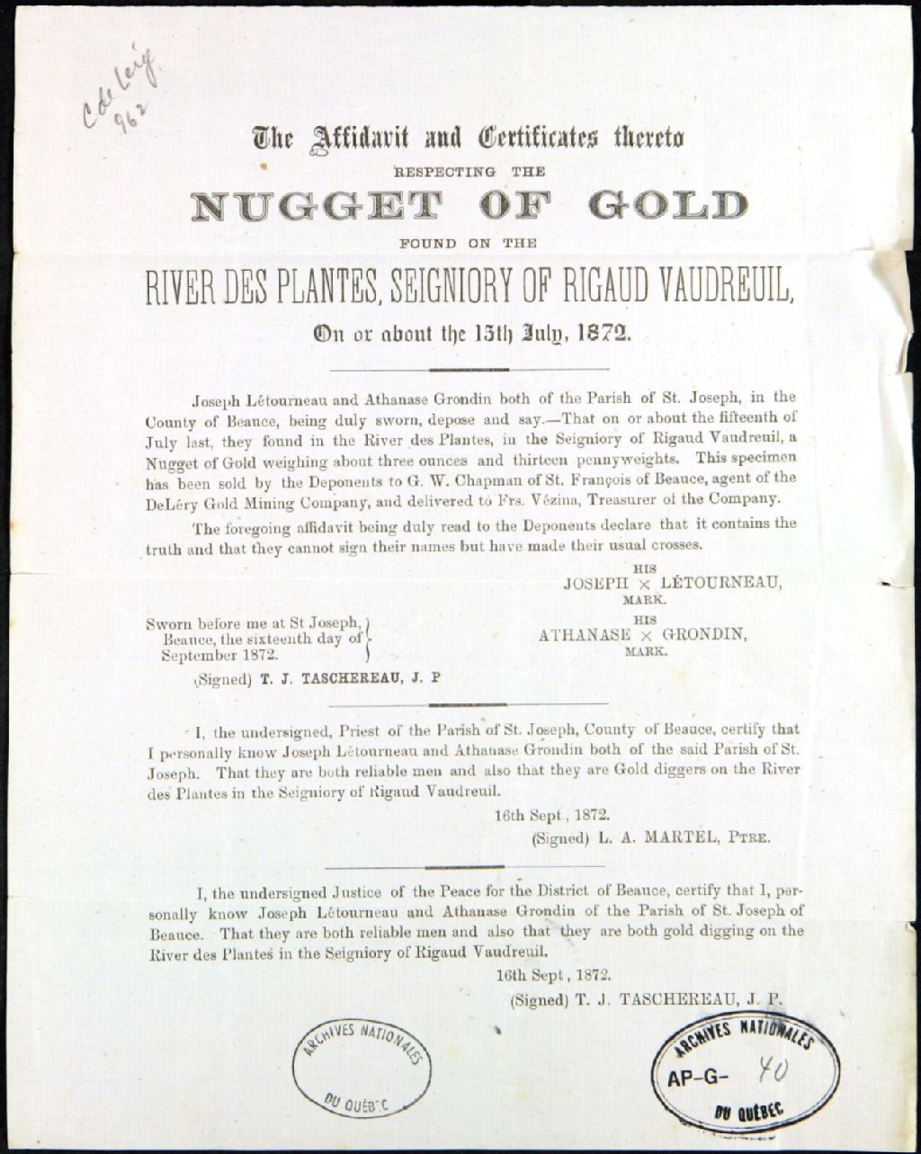 Acte intitulé «the Affidavit and Certificate thereto respecting the Nugget of Gold found on the River des Plantes, Seignory of Rigaud-Vaudreuil on or about the 15th July, 1872» - les pépites d'or ont été trouvées par Joseph Létourneau et Athanase Grondin de la paroisse de Saint-Joseph-de-Beauce; le notaire Thomas-Jacques Taschereau et le prêtre L. A. Martel ont signé l'acte
