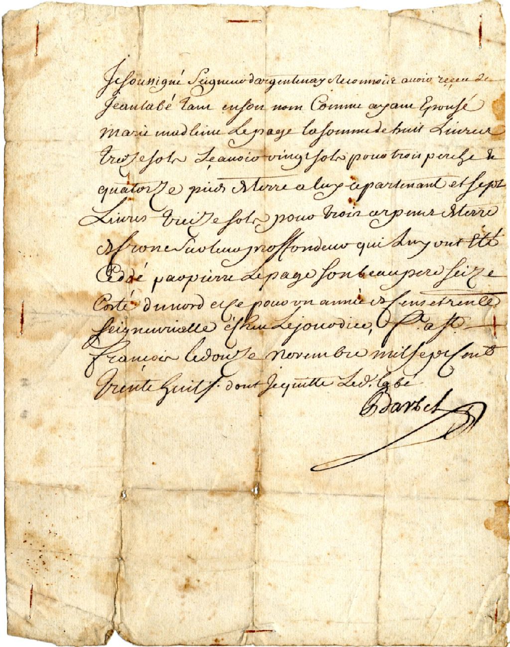 Reçu de Jacques Barbel, seigneur de l'arrière-fief d'Argentenay (à l'extrémité Est de l'Île d'Orléans) à l'endroit de "Jean Labé" pour la somme de 8 livres et 13 sols