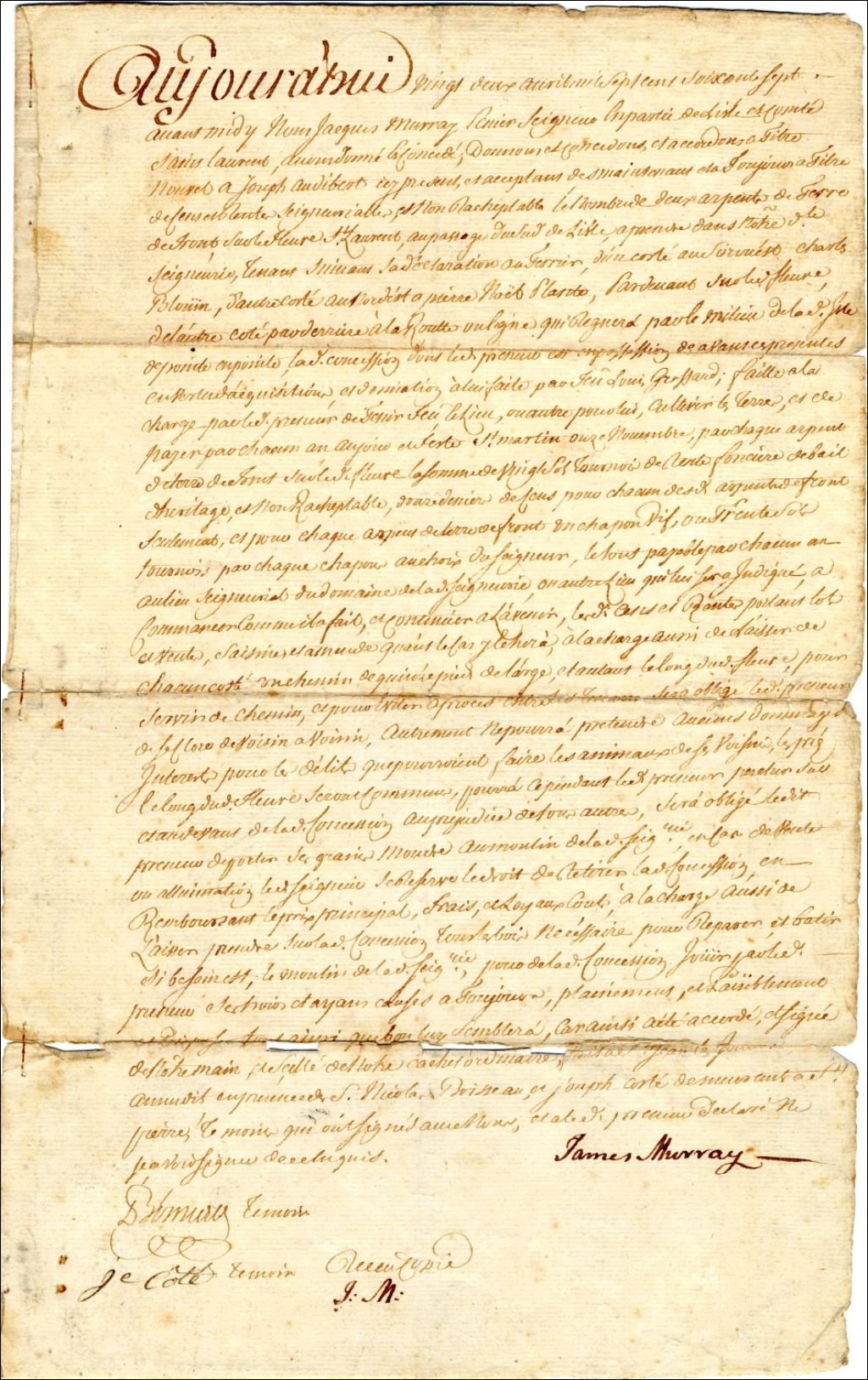 Concession de terre par James Murray à Joseph Audibert, à l'Île d'Orléans, signée devant les témoins Nicolas Primeau et Joseph Côté, 22 avril 1767, Archives nationales à Québec, Fonds Famille Pouliot, (03Q,P436,S999,P65).