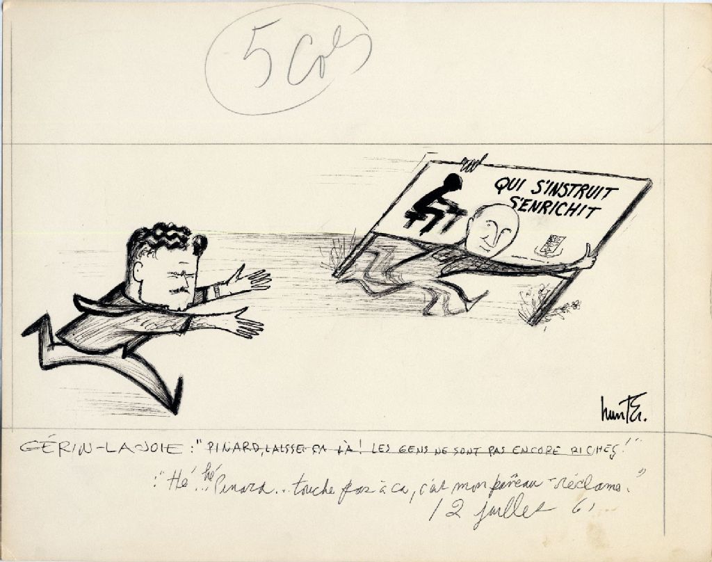 Qui s'instruit s'enrichit - Gérin-Lajoie : " Hé… hé… Pinard… touche pas à ça, c'est mon panneau-réclame ", 12 juillet 1961, Archives nationales à Québec, Fonds Raoul Hunter, (03Q,P716,S1,P61-07-12), Raoul Hunter.