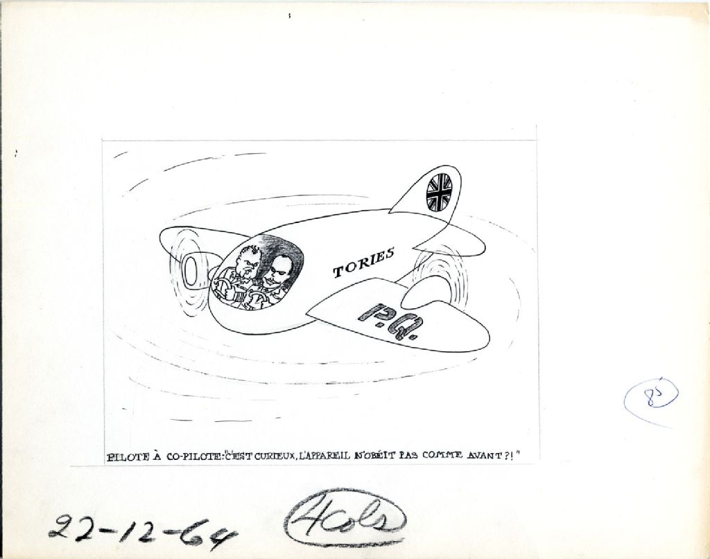 On peut voir John Diefenbaker et Leon Balcer dans un avion nommé «Tories» et avec le drapeau du Royaume-Uni. L'avion est hors de contrôle, car le réacteur de l'aile portant la mention P.Q. (province de Québec) est posé à l'envers