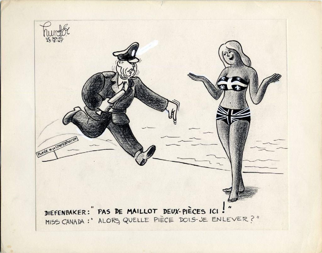 Diefenbaker : «Pas de maillot deux-pièces ici!» Miss Canada : «Alors, quelle pièce dois-je enlever?»