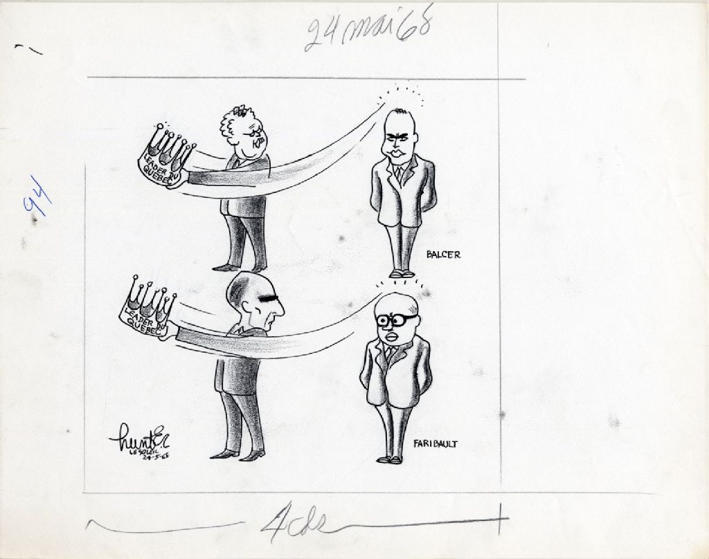 [John Difenbaker enlève une couronne à Léon Balcer; Robert Stanfield enlève une couronne à Marcel Faribeault], 24 mai 1968, Archives nationales à Québec, Fonds Raoul Hunter, (03Q,P716,S1,P68-05-24), Raoul Hunter.