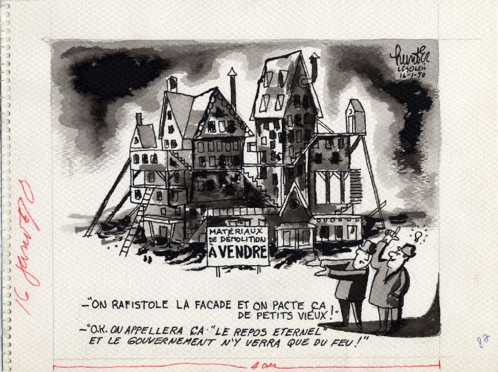 -«On rafistole la façade et on pacte ça de petits vieux!» -«O.k. On appellera ça " Le repos éternel" et le gouvernement n'y verra que du feu!», 16 janvier 1970, Archives nationales à Québec, Fonds Raoul Hunter, (03Q,P716,S1,P70-01-16), Raoul Hunter.