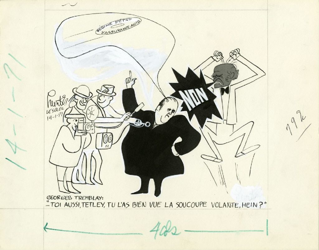 Georges Tremblay : «Toi aussi, Tetley, tu l'as bien vue la soucoupe volante, hein?», 14 janvier 1971, Archives nationales à Québec, Fonds Raoul Hunter, (03Q,P716,S1,P71-01-14), Raoul Hunter.
