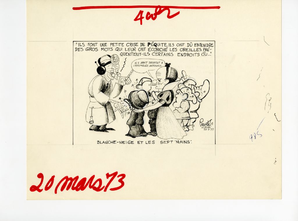 Blanche-neige et les sept "nains". "Ils font une petite crise de péquite. Ils ont dû entendre des gros mots qui leur ont écorché les oreilles. Fréquentent-ils certains endroits où..." "Ils vont souvent à l'assemblée nationale...", 20 mars 1973, Archives nationales à Québec, Fonds Raoul Hunter, (03Q,P716,S1,P73-03-20), Raoul Hunter.