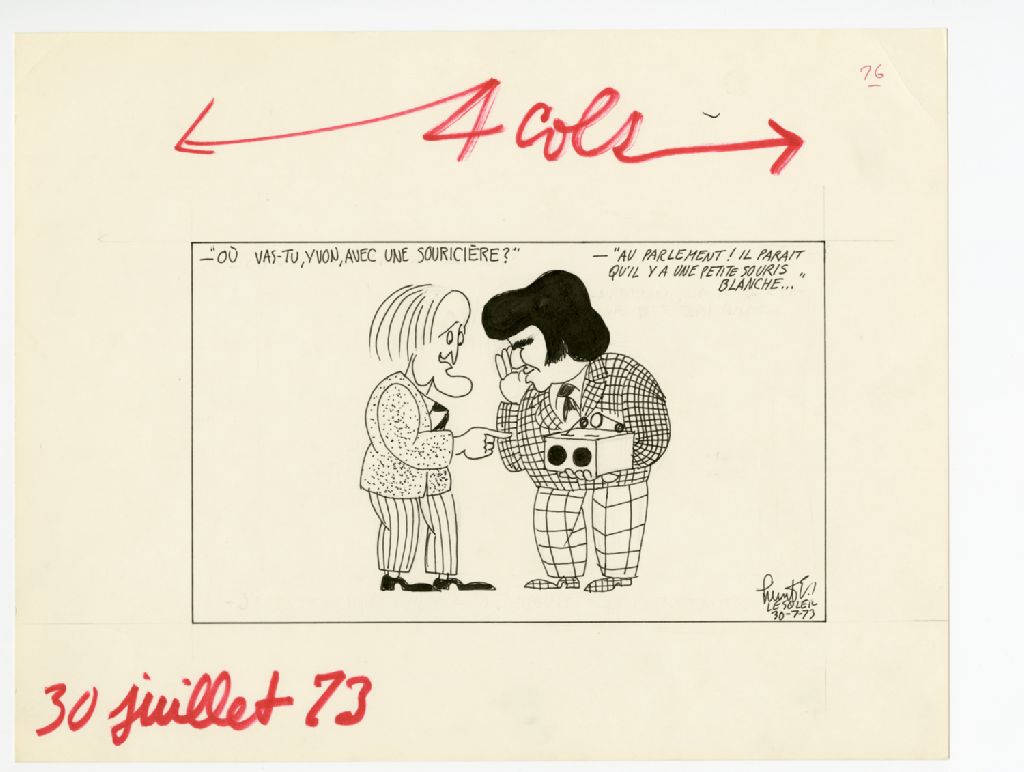 "Où vas-tu, Yvon, avec une souricière?" "Au Parlement! Il paraît qu'il y a une petite souris blanche..."