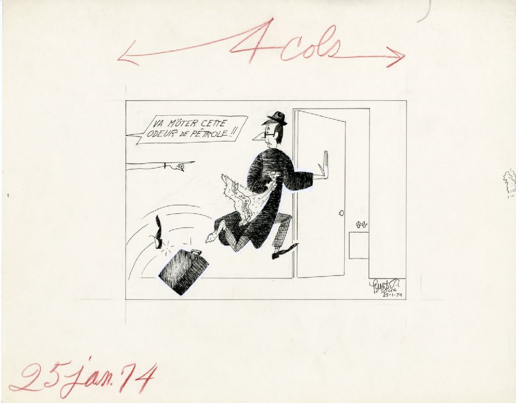 «Va m'ôter cette odeur de prétrole!!», 25 janvier 1974, Archives nationales à Québec, Fonds Raoul Hunter, (03Q,P716,S1,P74-01-25), Raoul Hunter.