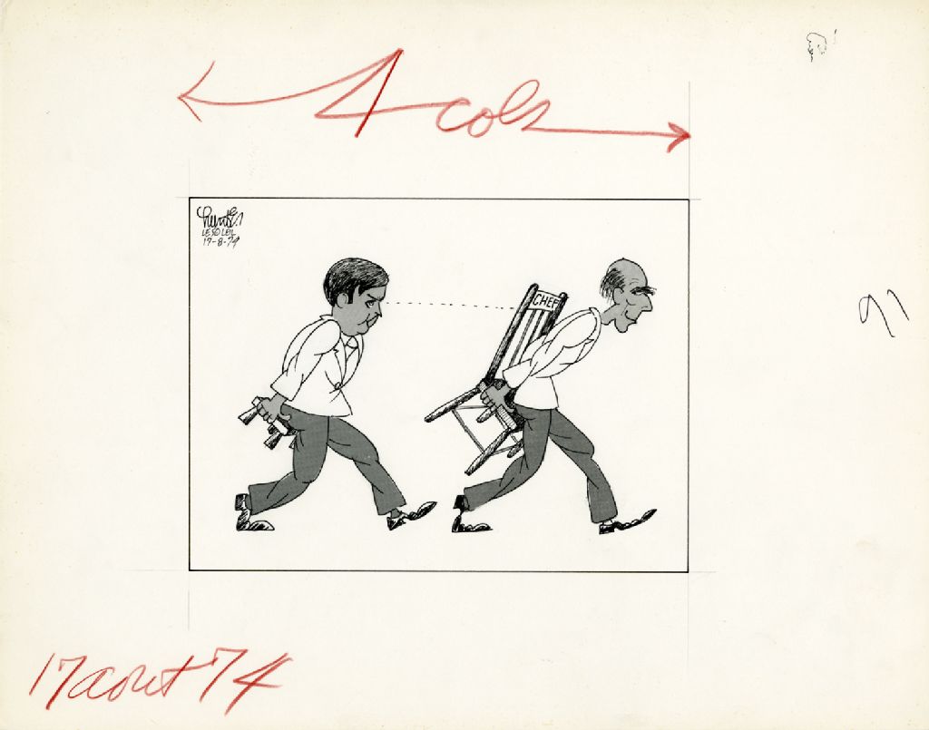 [Robert Stanfield, sur une chaise, se fait suivre par un homme sur un tabouret]