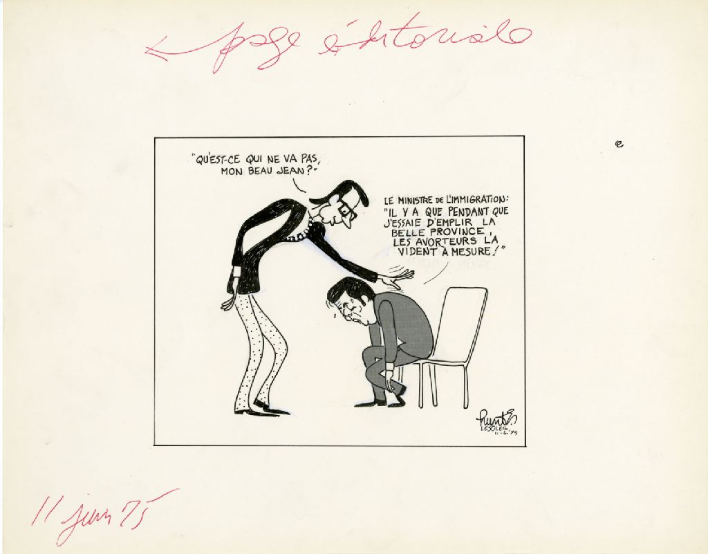 «Qu'est-ce qui ne va pas, mon beau Jean?» Le ministre de l'Immigration : «Il y a que pendant que j'essaie d'emplir la belle province, les avorteurs la vident à mesure!»