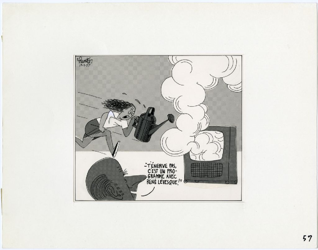 «T'énerve pas, c'est un programme avec René Lévesque!», 17 janvier 1977, Archives nationales à Québec, Fonds Raoul Hunter, (03Q,P716,S1,P77-01-17), Raoul Hunter.