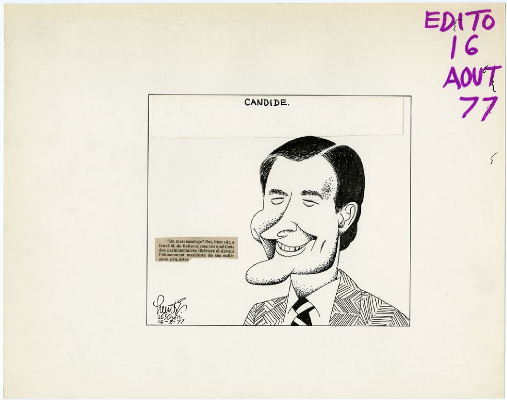 On peut lire sur une coupure de presse collée sur le dessin : «Du marchandage? Oui, bine sûr, a lancé M. de Belleval sous les quolibets des parlementaires libéraux et devant l'étonnement manifeste de ses collègues péquistes.»