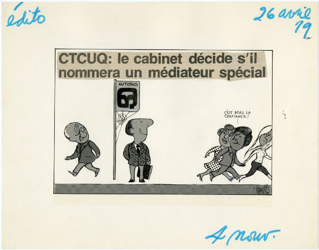 CTCUQ : le cabinet décide s'il nommera un médiateur spécial. «C'est beau la confiance!», 26 avril 1979, Archives nationales à Québec, Fonds Raoul Hunter, (03Q,P716,S1,P79-04-26), Raoul Hunter.