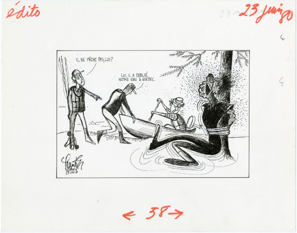 «Il ne pêche pas, lui?» «Lui, il a oublié notre gin à Québec»