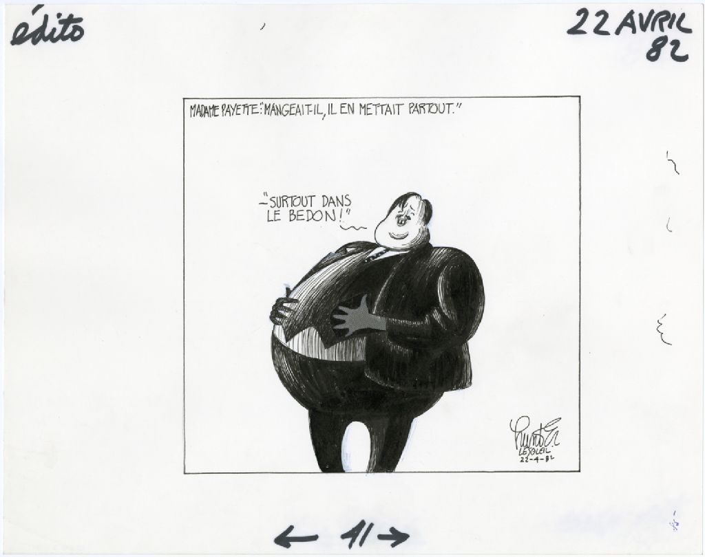 Madame Payette : «Mangeait-il, il en mettait partout.» «Surtout dans le bedon!», 22 avril 1982, Archives nationales à Québec, Fonds Raoul Hunter, (03Q,P716,S1,P82-04-22-1), Raoul Hunter.