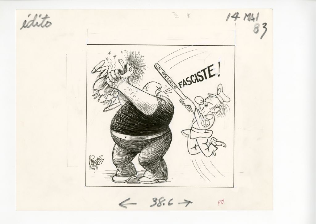 [Un homme en étrangle un autre alors que René Lévesque vient le frapper avec un bâton], 14 mai 1983, Archives nationales à Québec, Fonds Raoul Hunter, (03Q,P716,S1,P83-05-14-1), Raoul Hunter.