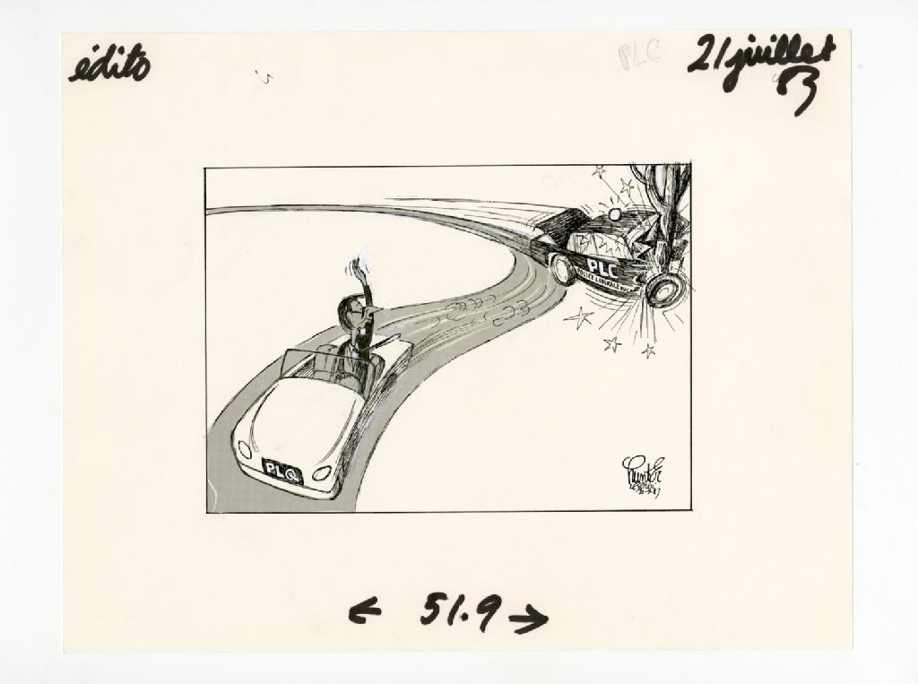 [Robert Bourassa s'enfui au volant d'une voiture alors qu'une voiture du Parti libéral du Canada s'enfonce dans un arbre], 21 juillet 1983, Archives nationales à Québec, Fonds Raoul Hunter, (03Q,P716,S1,P83-07-21), Raoul Hunter.