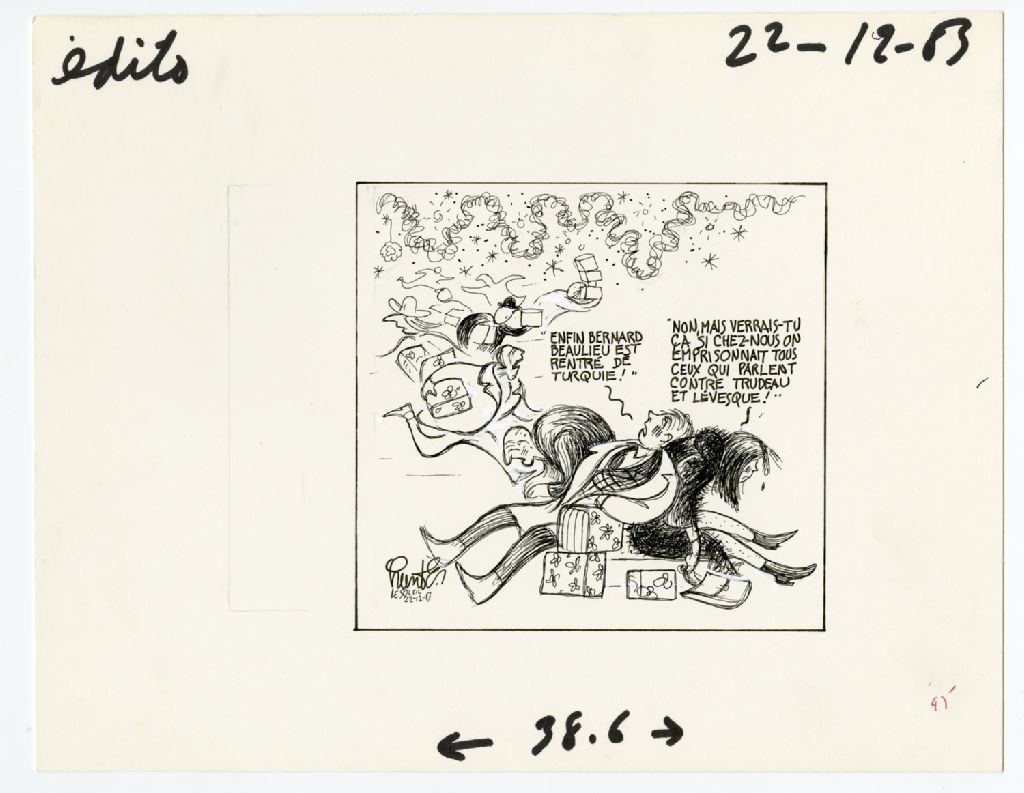 "Enfin Bernard Beaulieu est rentré de Turquie!" "Non, mais verrais-tu ça si chez-nous on emprisonnait tous ceux qui parlent contre Trudeau et Lévesque!"