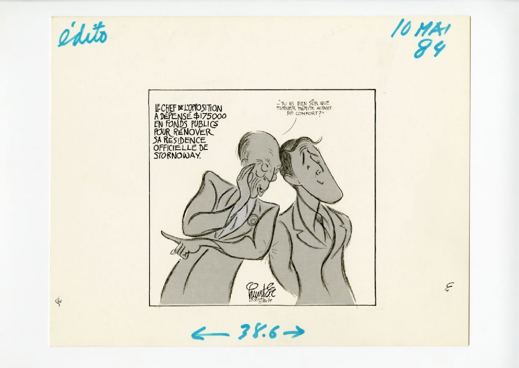 Le chef de l'opposition a dépensé 175 000$ en fonds publics pour rénover sa résidence officielle de Stornoway. "Tu es bien sûr que Turner mérite autant de confort?", 10 mai 1984, Archives nationales à Québec, Fonds Raoul Hunter, (03Q,P716,S1,P84-05-10), Raoul Hunter.