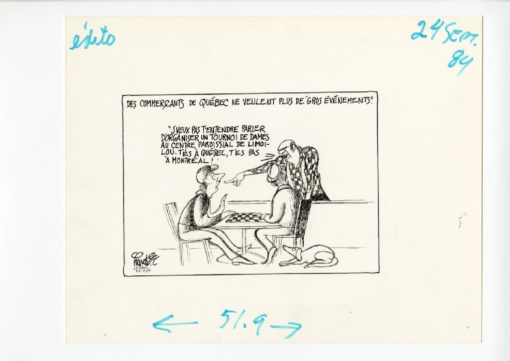 Des commerçants de Québec me veulent plus de "gros évènements". "J'veux pas t'entendre parler d'organiser un tournoi de dames au centre paroissial de Limoilou. T'es à Québec, t'es pas à Montréal!", 24 septembre 1984, Archives nationales à Québec, Fonds Raoul Hunter, (03Q,P716,S1,P84-09-24), Raoul Hunter.