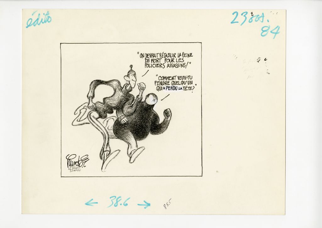 "On devrait rétablir la peine de mort pour les policiers assassins!" "Comment veux-tu pendre quelqu'un qui a perdu la tête?", 23 octobre 1984, Archives nationales à Québec, Fonds Raoul Hunter, (03Q,P716,S1,P84-10-23), Raoul Hunter.