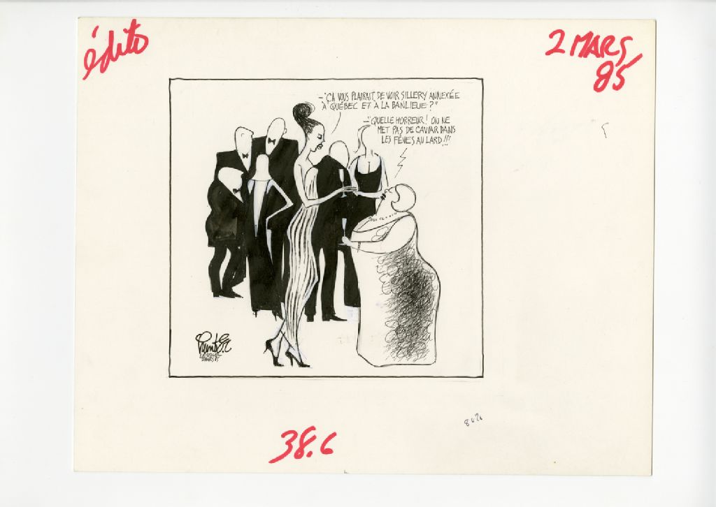 "Ça vous plairait de voir Sillery annexée à Québec et à la banlieue?" "Quelle horreur! On ne met pas de caviar dans les fèves au lard!!!", 02 mars 1985, Archives nationales à Québec, Fonds Raoul Hunter, (03Q,P716,S1,P85-03-02), Raoul Hunter.