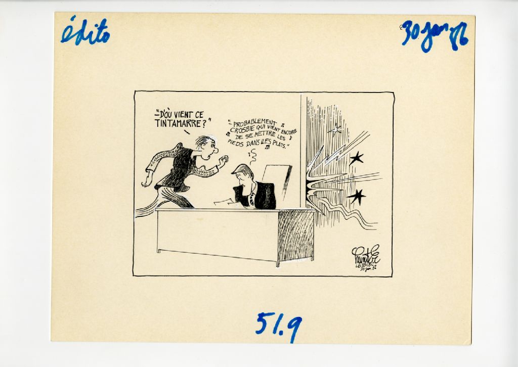 "D'où vient ce tintamarre?" "Probablement Crosbie qui vient encore de se mettre les pieds dans les plats."