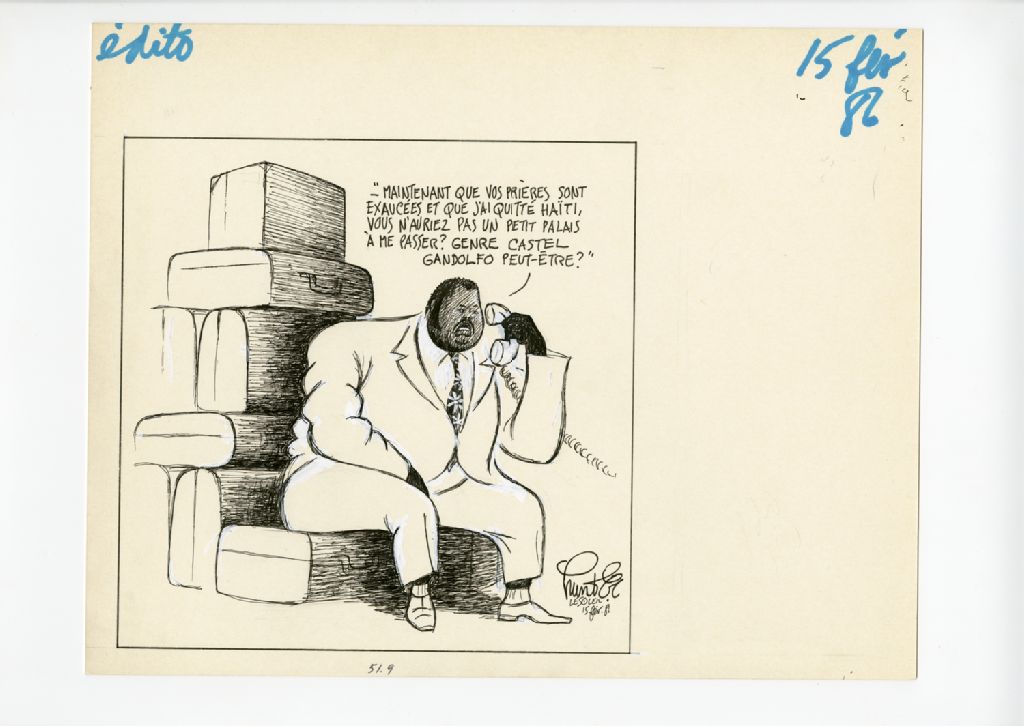 "Maintenant que vos prières sont exaucées et que j'ai quitté Haïti, vous n'auriez pas un petit palais à me passer? Genre Castel Gandolfo peut-être?", 14 février 1986, Archives nationales à Québec, Fonds Raoul Hunter, (03Q,P716,S1,P86-02-15), Raoul Hunter.