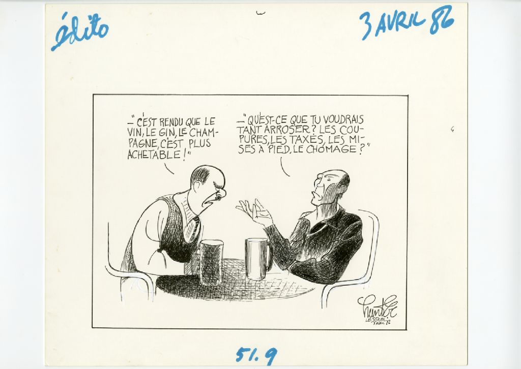"C'est rendu que le vin, le gin, le champagne, c'est plus achetable!" Qu'est-ce que tu voudrais tant arroser? Les coupures, les taxes, les mises à pied, le chômage?"