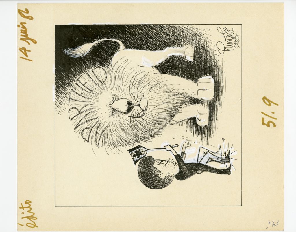 [Brian Mulroney devant un lion où il est écrit ''apartheid'']