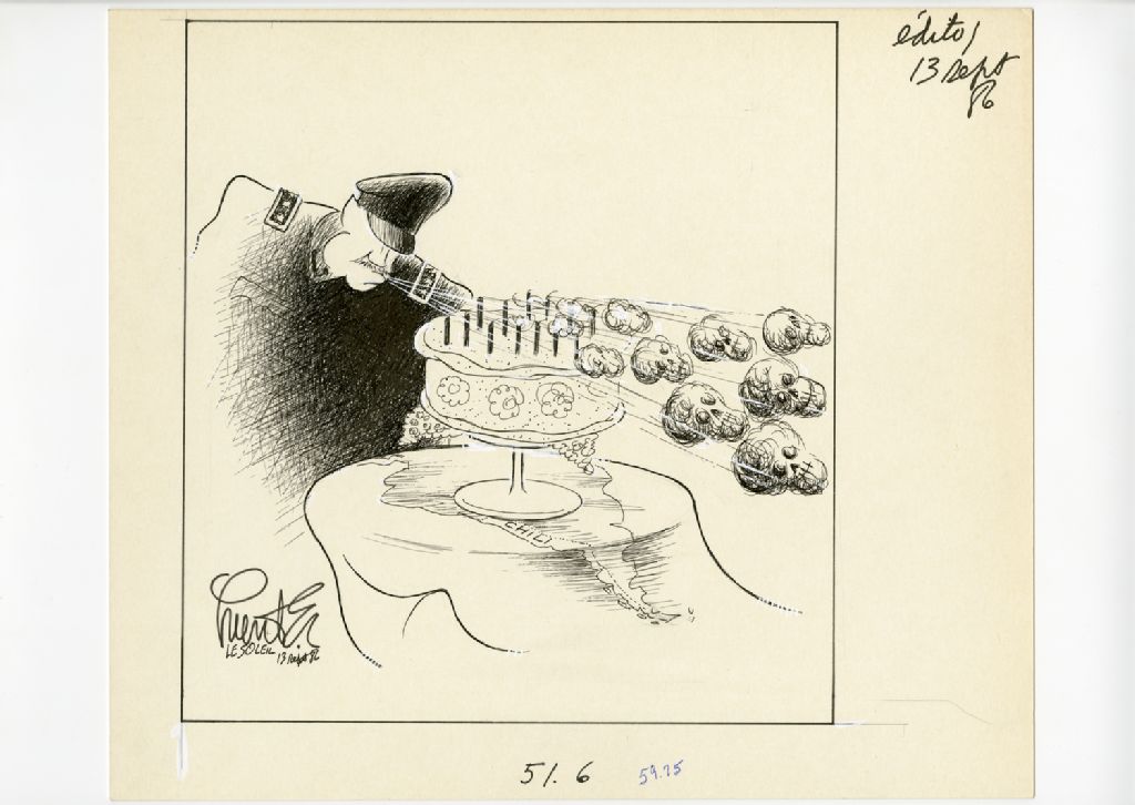 [Un général d'armée souffle sur les bougies d'un gâteau]