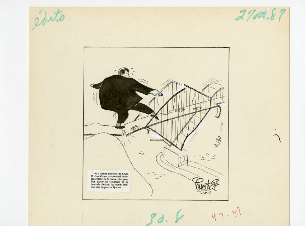 On peut lire sur une coupure de presse : "Le député péquiste de Lévis, M. Jean Garon, a convoqué les représentants de la presse, hier, pour leur parler de vieilleries et de bouts de chemins . Au menu: le piteux état du pont de Québec."