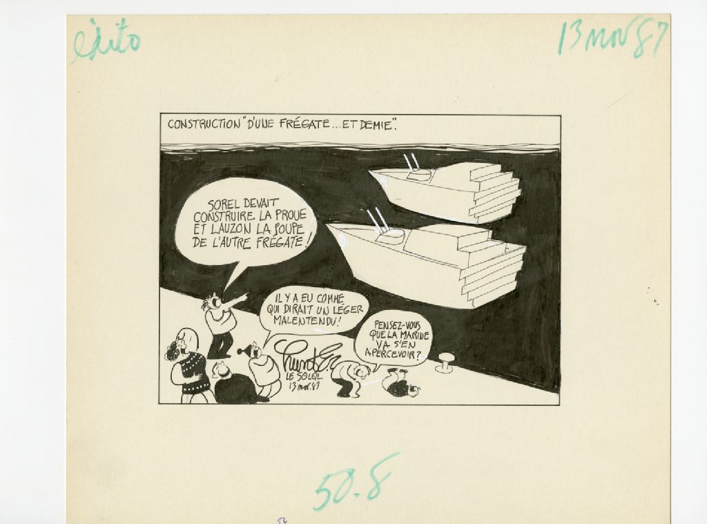 Construction "d'une frégate... et demie.", 13 novembre 1987, Archives nationales à Québec, Fonds Raoul Hunter, (03Q,P716,S1,P87-11-13), Raoul Hunter.