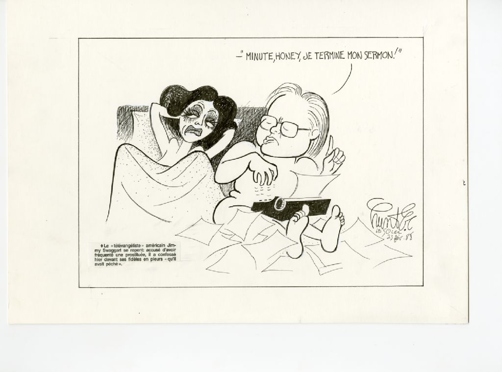 On peut lire sur une coupure de presse : "Le "télévangéliste" américain Jimmy Swaggart se repent: accusé d'avoir fréquenté une prostitué, il a confessé hier devant ses fidèles en pleurs "qu'il avait pêché"."