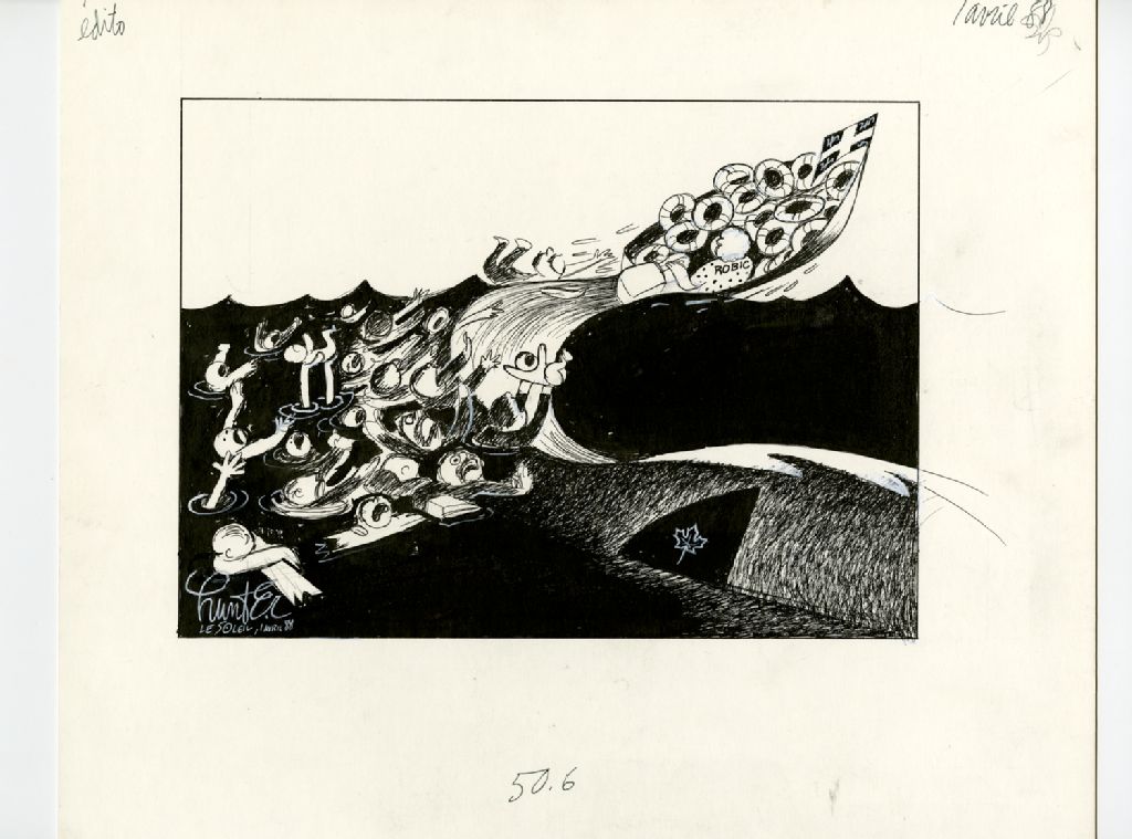 [Des gens se noient après avoir chaviré d'une chaloupe où on peut lire ''Robic'']