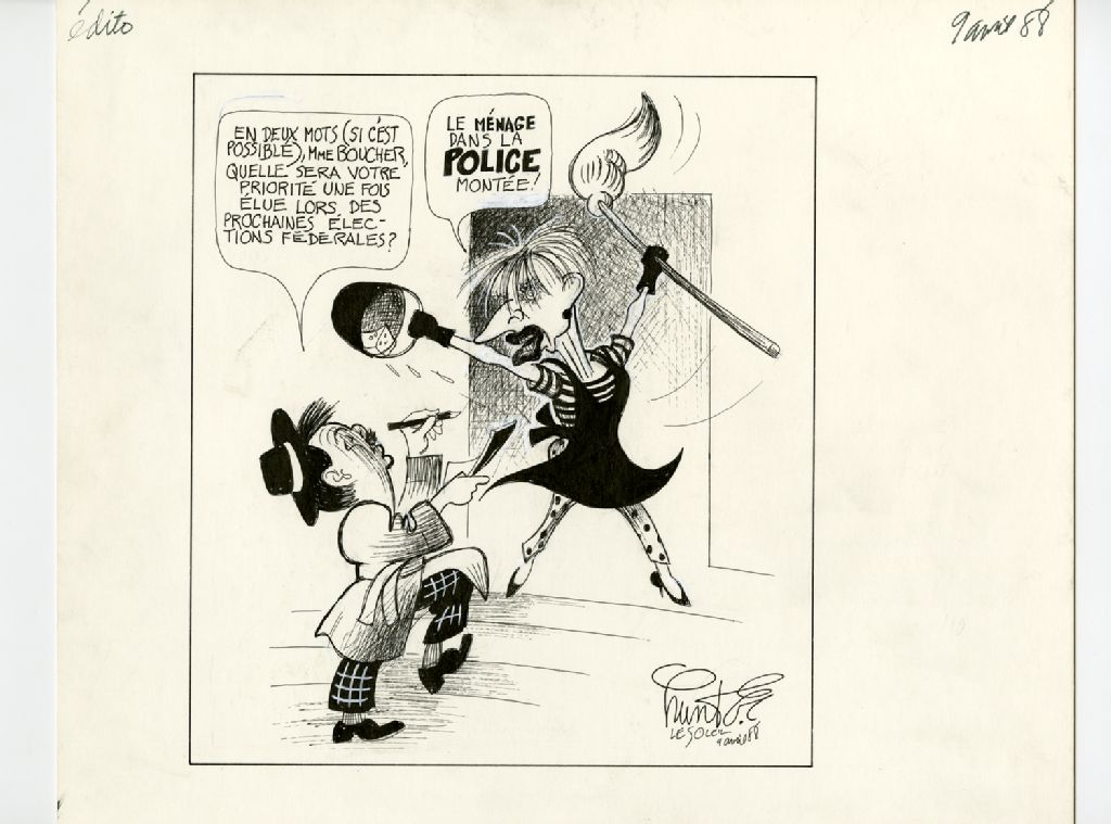 "En dexu mots (si c'est possible), Mme Boucher, quelle sera votre priorité une fois élue lors des prochaines élections fédérales?" "Le ménage dans la police montée!", 09 avril 1988, Archives nationales à Québec, Fonds Raoul Hunter, (03Q,P716,S1,P88-04-09), Raoul Hunter.