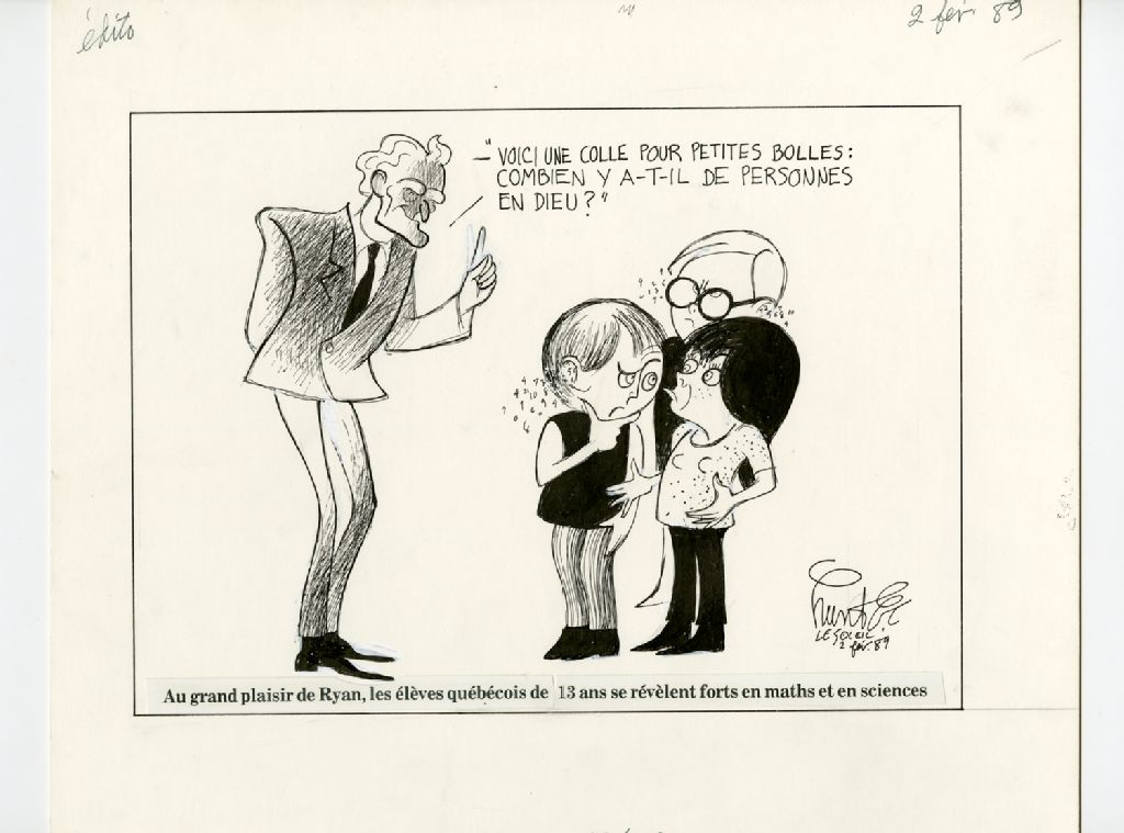 "Voici une colle pour petites bolles: combien y a-t-il de personnes en Dieu?", 02 février 1989, Archives nationales à Québec, Fonds Raoul Hunter, (03Q,P716,S1,P89-02-02), Raoul Hunter.