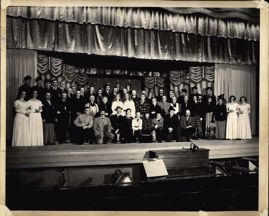 - Vue éloignée de la troupe au complet sur la scène, pour l'interprétation de l'oeuvre de Laurent Tremblay "Marchand de Québec" pièce historique en 4 actes