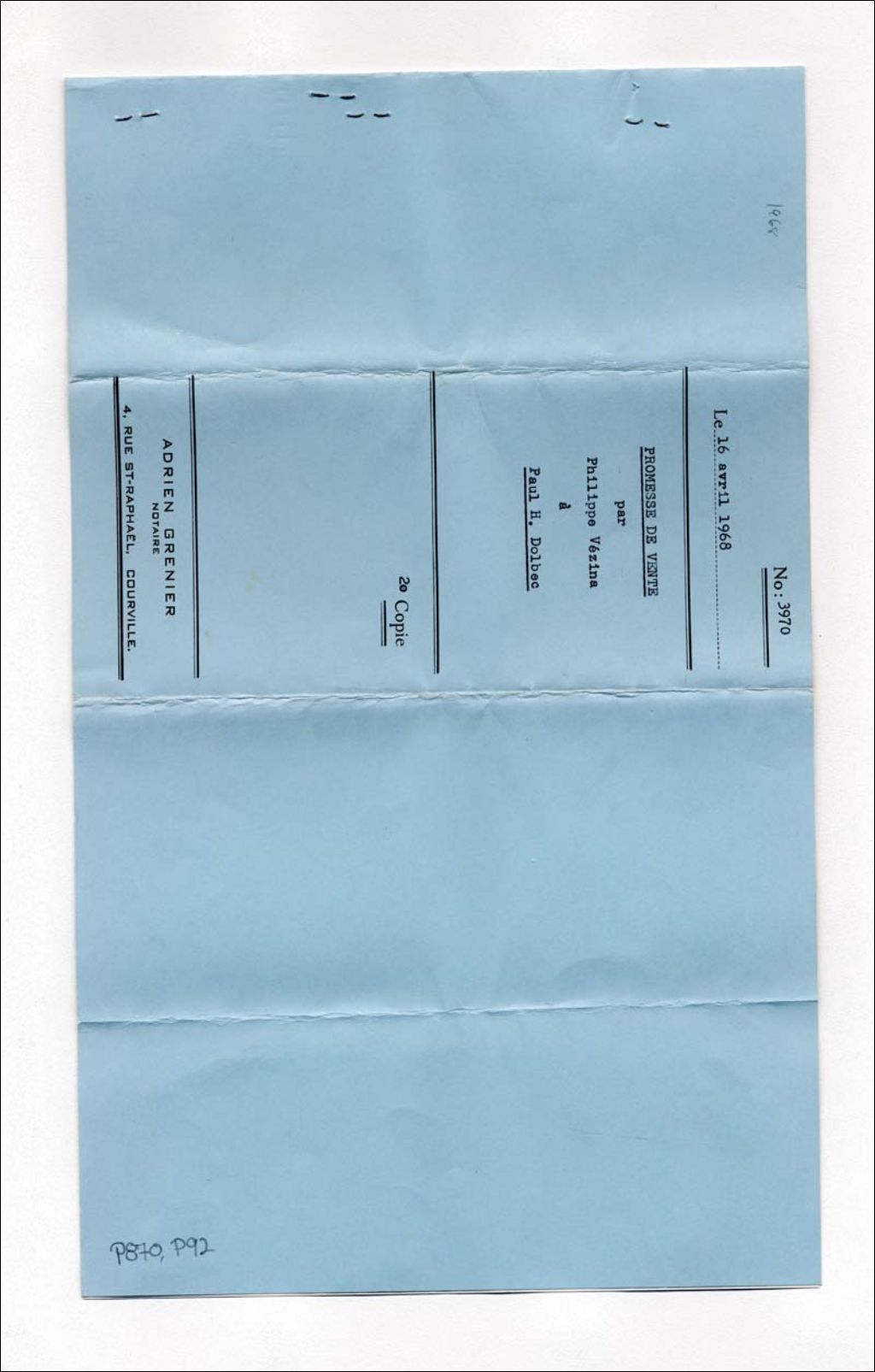 Promesse de vente par Philippe Vézina à Paul H. Dolbec, 16 avril 1968, Archives nationales à Québec, Fonds Maison Vézina, (03Q,P870,P92).